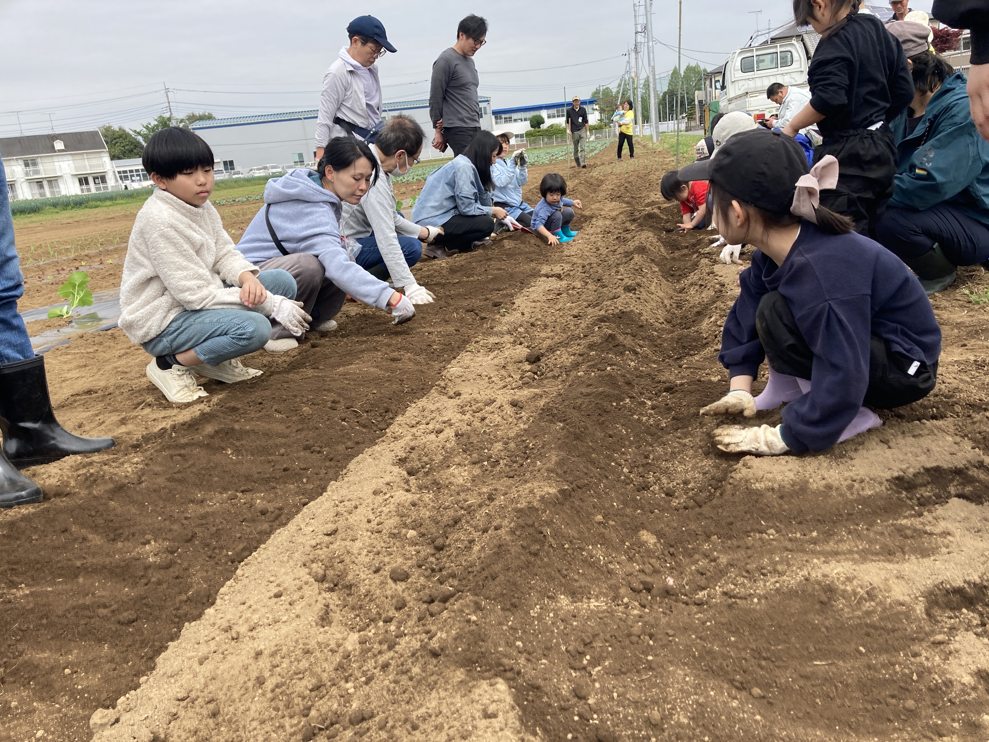 曇り空の絶好の農作業日和の中、16家族47名の皆様...と一緒にとうもろこしやかぼちゃなど様々な野菜の定植・播種作業を体験しました。生産者の方々の丁寧な指導で、初心者の方も安心して農作業を楽しんでいただけました。